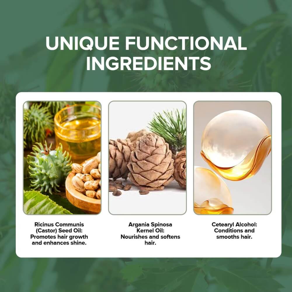 - Ricinus Communis (Castor) Seed Oil – Supports healthy hair growth, nourishes the strands, and enhances natural shine.